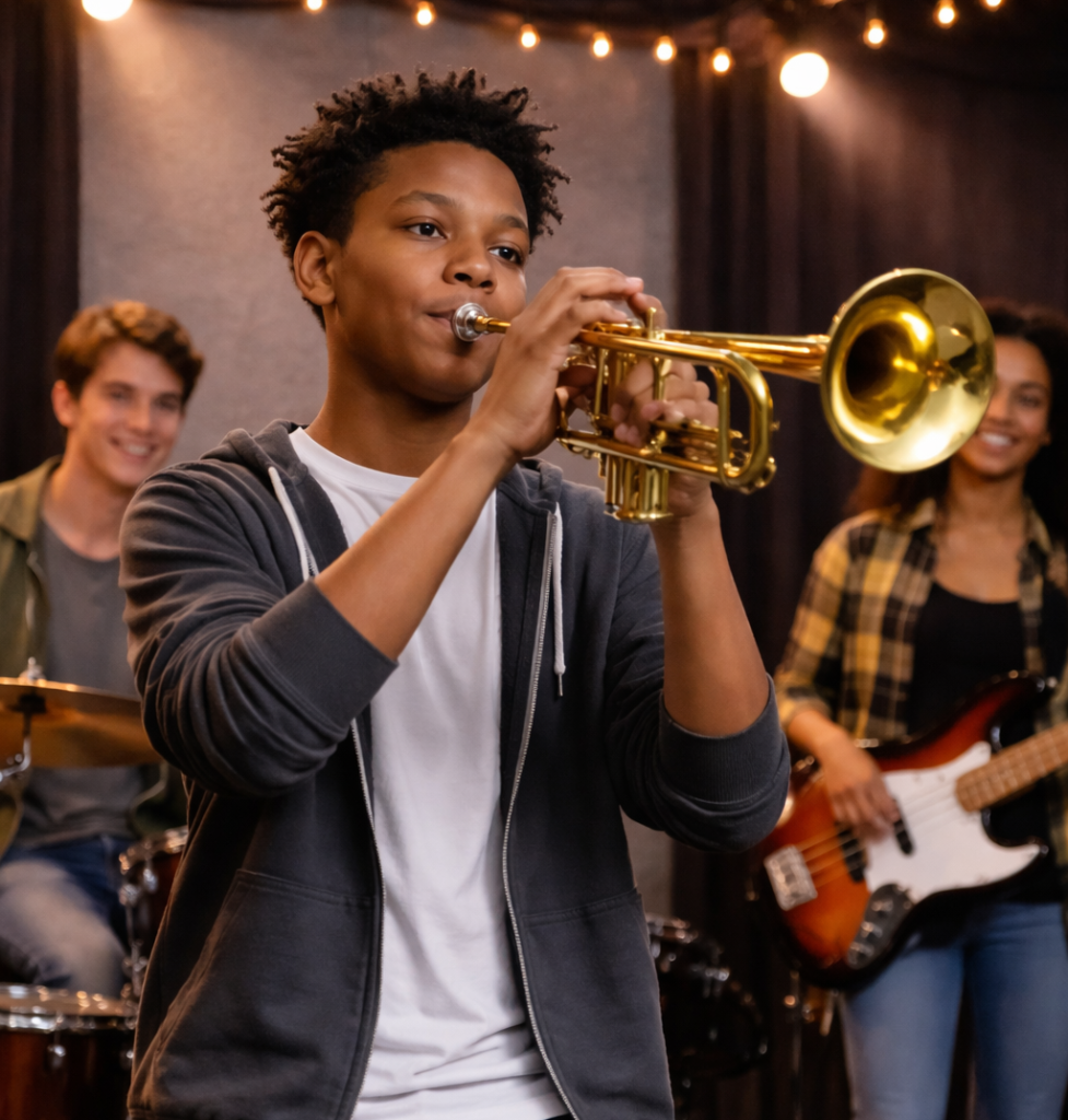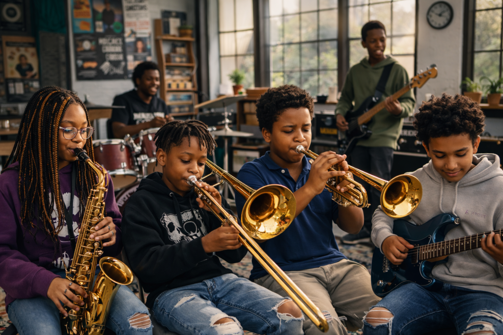 Music education helps young people build confidence, creativity, discipline, and teamwork. It gives students a space to express themselves, connect with others, and grow through mentorship and artistic exploration.